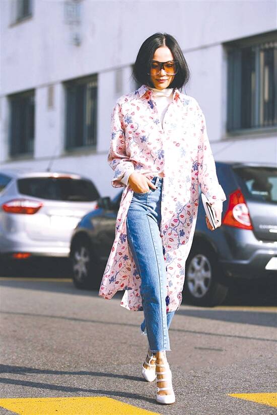 ▲ 衬衫裙里叠穿牛仔裤虽时髦,但驾驭起来还是有难度的,选择紧身牛仔裤,裤脚处最好多一点设计感如荷叶边、磨边等,看上去就不会有“裙子下面藏了条打底裤”的感觉。 |
