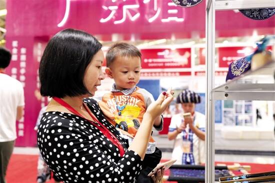 ■参展商秦女士带着孩子逛展,被重庆苗族饰品吸引住了。 |