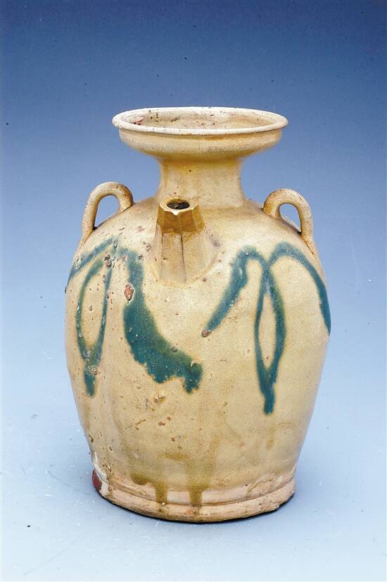 ■唐长沙窑青釉绿彩盘口双系瓷壶 |