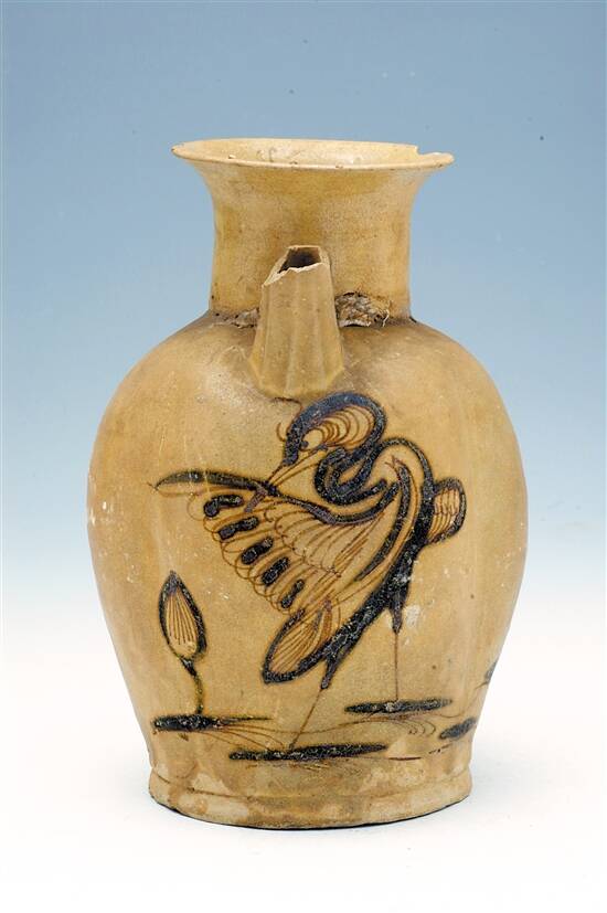 ■唐长沙窑青釉褐绿彩花鸟纹瓷壶 |