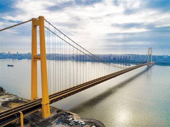 ■武汉杨泗港长江大桥8日通车,这是武汉市第10座长江大桥。大桥全长4.13公里,主跨1700米,一跨过江。大桥上层为城市快速路,双向6车道;下层为城市主干道,双向6车道。新华社发 |