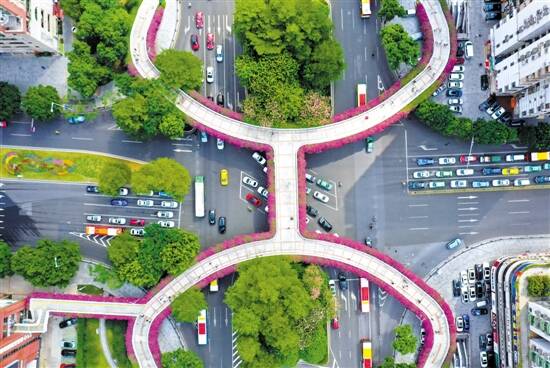 据悉,与往年广州人行天桥簕杜鹃色彩单一不同,今年共收集了大叶深紫、水红、粉红、玫红、柠檬黄、金心双色、加州黄花、樱花色、白花、银边粉紫、重苞大红等13个多花色品种的簕杜鹃应用于天桥绿化,营造出优美的七彩天桥绿化景观。 专家表示,由于今年雨水多,簕杜鹃的花期推迟到了8、9月份,因此正好在国庆节为广州披上了节日的盛装。 广州是国内最早进行桥梁绿化的城市之一,是国内桥梁绿化最多、景观效果最好的城市,达到了“四季常绿、四季有花”的效果。据悉,广州市林业和园林科学研究院是广州市天桥绿化主要施工和养护单位,通过近20年的技术攻关,拥有一套自主知识产权的桥梁绿化技术体系。 记者获悉,该系统通过数据监测设备实时监测土壤湿度、温度等数据,通过无线网络发送到中心控制器,中心控制器将收到的信息与设定阀值比对后,发出工作指令,指令灌溉设备是否启动电磁阀开关进行供水。这套灌溉系统根据植物生长情况和天气情况进行有效、精准供水,最大限度满足植物生长对水分的需求,既节约用水,又节约人工,保证了桥梁绿化的景观效果,有效提升了养护质量。 天桥簕杜鹃赏花攻略 东晓南立交桥,是广州布置簕杜鹃最长的单座桥梁,绿化长度有七千多米;五羊新城人行天桥簕杜鹃盛开,整座桥呈紫红色的H形,可谓是广州形态最美的簕杜鹃装饰桥梁;环市路、东风路、解放路的桥梁是绿化分布最集中的几座,在这里市民可以欣赏到数量最多的簕杜鹃。此外,在人民北路-东风路东侧和广园快速路车陂立交西侧,可分别欣赏到今年新增的柠檬黄勒杜鹃和樱花簕杜鹃。