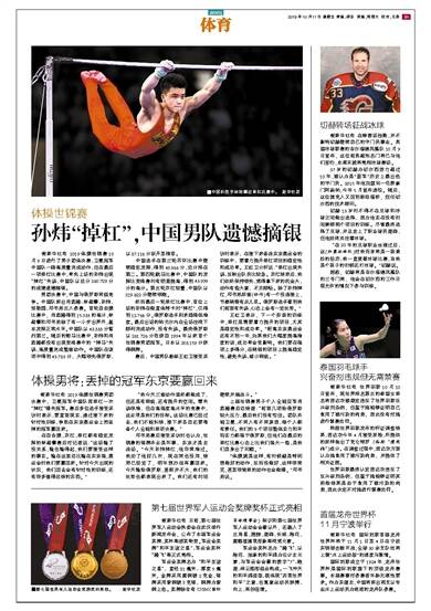 据新华社电 2019体操世锦赛10月9日进行了男子团体决赛,卫冕冠军中国队一路高质量完成动作,但在最后一项单杠比赛中,率先上场的孙炜出现“掉杠”失误,中国队以总分260.729分的成绩遗