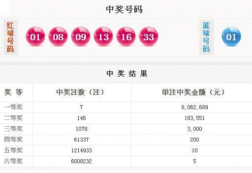 深圳56元复式中头奖 第19116期双色球的中奖号码为:红球“01、08、09、13、16、33”;蓝球“01”。当期红球大小比1∶5,三区比3∶2∶1,奇偶比4∶2,其中“09”为隔期跳号,开出一组二连号“08、09”,同时开出一组同尾号“13、33”;蓝球则开出隔期跳码“01”,这也是该号在短短6期内第四度现身。 当期中出一等奖7注,单注奖金806万多元。这7注一等奖花落7地,广东、辽宁、江苏、重庆、河南、四川、云南各中出1注。广东的头奖落户深圳,中奖彩票是一张56元的自选复式票,由龙华区民治街道上塘东二村东头旧围5栋102铺的83020420投注站售出。 奖池上涨 至10.47亿 同期二等奖中出146注,单注奖金18万多元。其中,江西中出21注,为全国中出二等奖最多的地区,辽宁中出19注,广东中出18注,内蒙古、江苏分别中出11注,河北中出10注,其它地区二等奖均低于10注。当期末等奖开出600万多注。 当期全国销量3.36亿多元。广东继续以3728万多元的成绩高居销售榜首。 开奖后,双色球奖池储备上涨至10.47亿多元,周日晚的第19117期开奖中,彩民2元单倍投注最高仍可中得1000万元奖金。