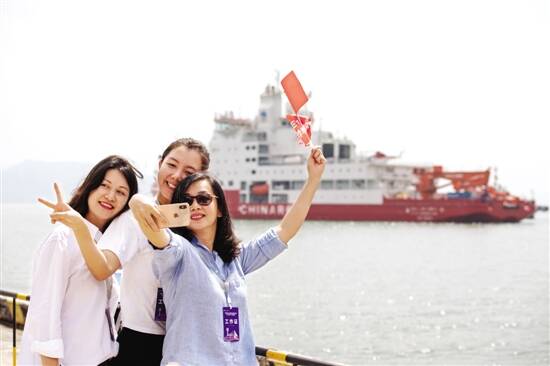 ■13日,“雪龙2”号抵深圳蛇口太子湾邮轮母港,工作人员与其自拍合影。新华社发 |