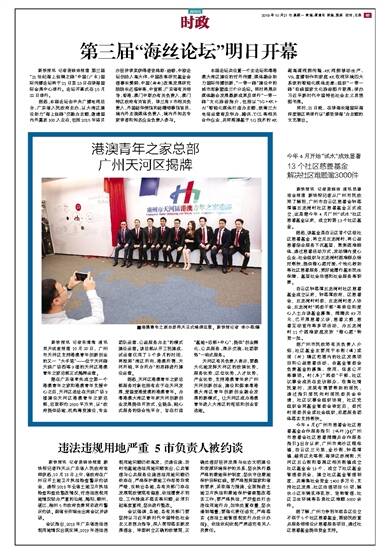 新快报讯 记者朱清海 通讯员天统宣报道 10月20日,广州市天河区支持港澳青年创新创业的又一“大手笔”——位于天河路天娱广场西塔9楼的天河区港澳青年之家总部正式揭牌运