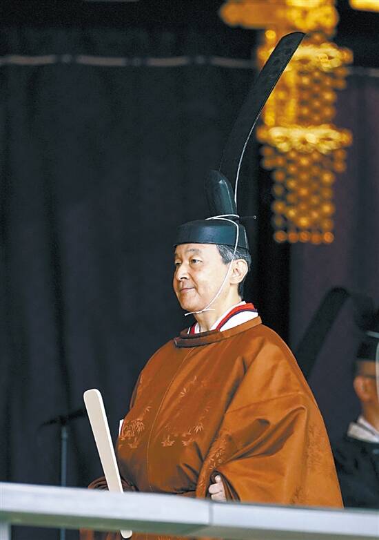 ■10月22日,日本德仁天皇(中)在东京皇居正殿参加即位仪式(“即位礼正殿之仪”)。 新华社发 |