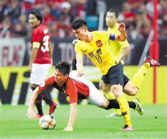 ■上一场在客场,广州恒大队球员郑智(右)与浦和红钻队球员长泽和辉拼抢。 新华社发 |