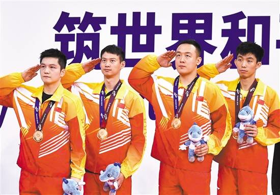 ■中国队球员樊振东、周雨、徐晨皓、周恺(从左至右)登上领奖台。新华社发 |