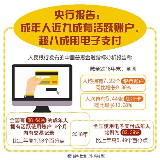人民银行发布的中国普惠金融指标分析报告称,全国及农村地区人均账户和持卡量持续稳步增长,活跃使用账户拥有率较上年小幅提升。截至2018年末,全国人均拥有7.22个银行账户,同比增长9.39%;人均持有5.44张银行卡,同比增长13.08%。2018年,全国有88.64%的成年人拥有活跃使用账户,6个月内有交易记录,比上年高1.58个百分点。 与此同时,我国积极稳妥推进移动支付等现代支付工具发展,取得较好成效。2018年,全国使用电子支付成年人比例为82.39%,比上年高5.49个百分点;农村地区使用电子支付成年人比例为72.15%,比上年高5.64个百分点。 另外,报告显示,2018年,全国平均有47.81%的成年人购买过投资理财产品,农村地区这一比例为36.11%。获得过借款的成年人比例与上年基本持平。 报告认为,2018年,人民银行系统联合相关部门出台了多项举措,引导金融资源更好服务小微企业,有力支持小微企业合理的信贷需求,普惠口径小微贷款增长迅速。2018年普惠口径小微贷款增加1.22万亿元,同比多增6143亿元。