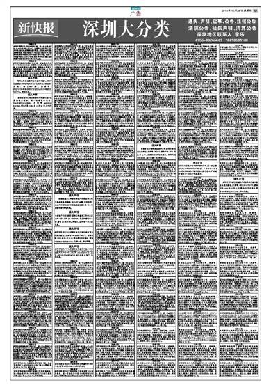 0755-83265607 18818581188 清算公告 深圳市满棠红生态园林有限公司,统一社会信用代码:91440300306110755C,经股东会决议终止营业并注销,现已组成清算组进行清算,清算组由何艳香,林丽君组成,请有关债权人于见报之日起45天内到我司清算组申报债权及办理债权登记手续。联系人:何艳香,电话:18820170966地址:深圳市罗湖区莲塘街道长岭路东方尊峪三栋三单元8A。 清算公告 深圳市深薪林礼品有限公司,统一社会信用代码:91440300335323426X,经股东决定终止营业并注销,现已组成清算组进行清算,清算组由邱潮江,胡典梁组成,请有关债权人于见报之日起45天内到我司清算组申报债权及办理债权登记手续。联系人:邱潮江,电话:18820202092地址:深圳市福田区园岭街道百花一路2号百花园二期6栋6A。 遗失声明 梅州永华货运服务公司遗失中国人民财产保险股份有限公司深圳市分公司承保车辆保单,车牌:粤ZCW07港,保单号:PDZA201944030109011712、PDAA20194403010 9011712。声明作废。 遗失声明 深圳市宝安区西乡深创电子贸易行遗失营业执照正副本,统一社会信用代码:92440300L12016096U,注册号:44030630 0152060,核准日期:2005年11月04日,声明作废。 清算公告 深圳市东岱科技有限公司,统一社会信用代码:91440300066344957H,经股东会决议终止营业并注销,现已组成清算组进行清算,清算组由王海生,崔丽丽组成,请有关债权人于见报之日起45天内到我司清算组申报债权及办理债权登记手续。联系人:崔丽丽,电话:18126516909地址:深圳市福田区华强北街道赛格科技工业园4栋6层A-C轴与17-21A16。 清算公告 深圳市嘉世丰贸易有限公司,统一社会信用代码:91440300326224565D,经股东会决议终止营业并注销,现已组成清算组进行清算,清算组由林滦楷,张泽滨组成,请有关债权人于见报之日起45天内到我司清算组申报债权及办理债权登记手续。联系人:林滦楷,电话:18818521461地址:深圳市龙华新区民治街道向南四区23号松花大厦705。 清算公告 深圳码头老火锅餐饮管理有限公司(统一社会信用代码:91440300MA5DT91P1W)经股东会决议终止营业,成立清算组,清算组成员由莫玉美、赵东梅两人组成,请有关债权人于见报之日起45天内到我司清算组申报债权及办理债权登记手续。特此公告联络人:吕丹文,电话:13560789467 地址:深圳市龙华新区民治街道民治大道690号东盟大厦联沣广场一楼A8、A9、A28铺。 清算公告 深圳市双核园科技有限公司,统一社会信用代码91440300306269256D,经公司股东决定终止营业并注销,现已成立清算组进行清算,清算组由刘兰组成,请有关债权人于本公告见报之日起45日内到我公司清算组办理债权申报及债权登记手续。联系电话:18838985989,联系人:刘兰,地址:深圳市龙华新区龙华街道望成路54栋307。 清算公告 深圳市融利达源商贸有限公司,注册号:44030 6106392951,经股东决定终止营业并注销,现已组成清算组进行清算,清算组由翁友群组成,请有关债权人于见报之日起45天内到我司清算组申报债权及办理债权登记手续。联系人:翁友群,电话:13924656338地址:深圳市龙华新区观澜办事处茜坑社区福民路178号202(办公场所)。 清算公告 深圳市黛天娇内衣有限公司,统一社会信用代码:91440300398427353G,经股东会决议终止营业并注销,现已组成清算组进行清算,清算组由彭裕龙,柯燕娟组成,请有关债权人于见报之日起45天内到我司清算组申报债权及办理债权登记手续。联系人:柯燕娟,电话:17388765592地址:深圳市龙岗区横岗街道六约社区龙岗大道安信大厦603室。 遗失声明 深圳市同和伟业包装制品有限公司(统一社会信用代码91440300064951550A)遗失金税盘,盘号661811217703,声明作废。 清算公告 深圳市和福堂养生素食管理有限公司,统一社会信用代码 914403003500316752,经股东会决议终止营业并注销,现已组成清算组进行清算,清算组由陈吉娜、金志勇组成,请有关债权人于见报之日起45天内到我公司清算组申报债权及办理债权登记手续。联系电话:18923742116,联系人:金志勇,地址:深圳市龙华新区民治街道民兴路与民福路交汇特区1980文化创意园三期1栋A座A203室。 清算公告 深圳市鑫鸿都休闲会所有限公司,统一社会信用代码914403003263286717,经股东决定终止营业并注销,现已组成清算组进行清算,清算组由黄燕霞组成,请有关债权人于见报之日起45天内到我公司清算组申报债权及办理债权登记手续。联系电话:13714832364,联系人:黄燕霞,地址:深圳市宝安区西乡街道宝源路海滨新村1017号二楼。 清算公告 深圳市青木组合软装设计有限公司,统一社会信用代码914403003428095396,经公司股东决定终止营业并注销,现已成立清算组进行清算,清算组由杜军组成,请有关债权人于本公告见报之日起45日内到我公司清算组办理债权申报及债权登记手续。联系电话:13528709899,联系人:杜军,地址:深圳市宝安区新安街道宝城前进一路天源大厦H807。 清算公告 深圳市桃太郎实业有限公司统一社会信用代码914403007084103557,经股东会决议终止营业并注销,现由李达华、孟焱炜组成清算组进行清算,请相关债权人自公告登报之日起45天内到我公司清算组申报债权并办理债权登记手续。联系人:孟焱炜13500066080,地址:深圳市龙岗区龙城街道嶂背社区科技园路11号(厂房)501。 清算公告 深圳市前海蒲香咖啡有限公司,统一社会信用代码91440300360073668R,经公司股东决定终止营业并注销,现已成立清算组进行清算,清算组由深圳