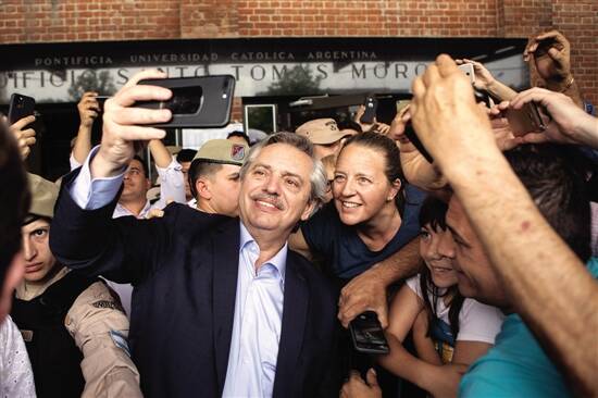 ■10月27日,阿尔韦托·费尔南德斯(中)在阿根廷布宜诺斯艾利斯的一个投票点与支持者合影。新华社发 |