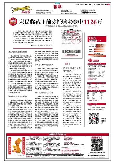 10月27日晚,双色球第19123期井喷19注559万多元头奖,销量处于榜首的广东收获了3注头奖,分落江门和肇庆。其中江门蓬江区棠下镇桐井大道同乐路的44120317投注站售出的一张2倍