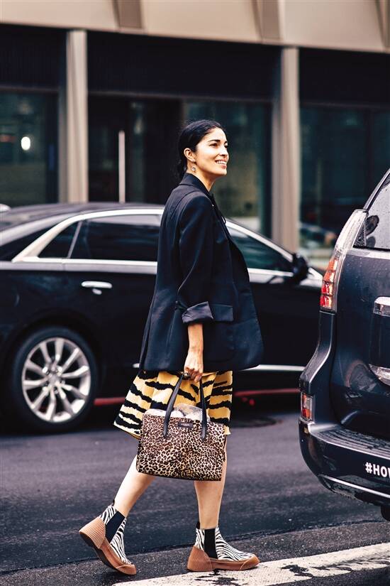 ▲让动物纹头尾呼应,可避免搭配上出现“头重脚轻”或“头轻脚重”的失衡感,中间段则可以交给与花纹同色系的单品来稳住,这个小秘诀显高一百分。 |