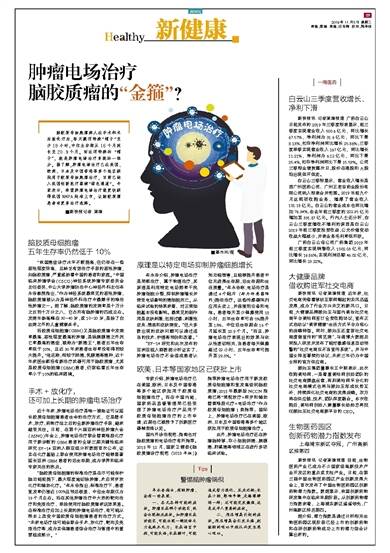 脑胶质母细胞瘤病人在手术和术后放化疗后,每天戴顶特殊“帽子”至少18小时,中位生存期从16个月延长至20.9个月。而这顶特殊的“帽子”,就是肿瘤电场治疗系统的一部分。据了解,肿瘤电场治疗已在美国、
