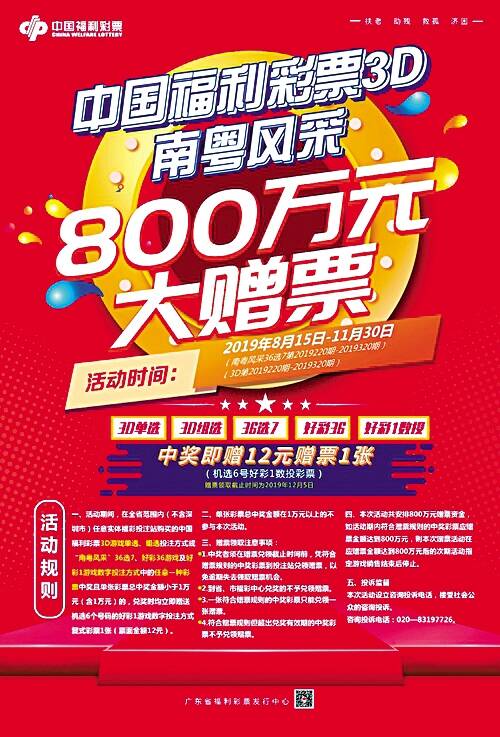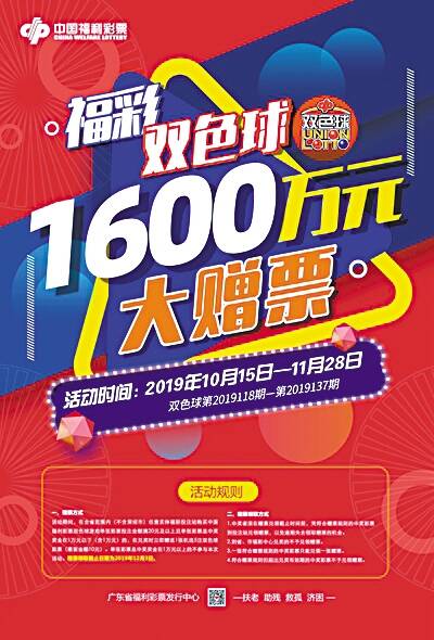 惊喜1 双色球12亿元大派奖 从双色球第19129期(开奖日期为2019年11月10日星期日)开始,连续20期在全国范围内开展2019年双色球游戏12亿元派奖活动。为了让更多购彩彩民们享受到派奖活动的实惠,此次将针对一等奖和六等奖进行派奖。一等奖派奖奖金分为特别奖和普惠奖,分别派送6亿元和1亿元,而六等奖翻番奖的奖金为5亿元,单票金额20元(含)以上的彩票中得一等奖和六等奖均有可能享受奖金翻番的惊喜。 惊喜2 广东福彩双色球 1600万元赠票活动 2019年10月15日(双色球第19118期)至2019年11月28日(双色球第19137期)。活动期间,在全省范围内(不含深圳市)任意实体福彩投注站购买中国福利彩票双色球游戏单张彩票投注金额满20元及以上且单张彩票总中奖金额少于1万元(含)的,在兑奖时立即赠送1张机选5注双色球彩票(票面金额10元)。单张彩票总中奖金额在1万元以上的不参与本次活动。截至2019年10月30日,全省已经赠出677万多元,剩余赠票金额922万多元。 惊喜3 广东福彩南粤风采、3D游戏800万元赠票活动 2019年8月15日(南粤风采36选7第19220期、3D第19220期)起至2019年11月30日(南粤风采36选7第19320期、3D第19320期)。活动期间,在全省范围内(不含深圳市)任意实体福彩投注站购买福彩3D游戏单选、组选投注方式或南粤风采36选7、好彩36及好彩1游戏数字投注方式中的任意一种彩票中奖,且单张彩票总中奖金额小于1万元(含1万元)的,兑奖时均立即赠送机选6个号码的好彩1游戏数字投注方式复式彩票1张(票面金额12元)。单张彩票总中奖金额在1万元以上的不参与本次活动。 截至2019年10月30日,全省已经赠出彩票54万多张,共赠出金额652万多元,剩余赠票金额147万多元。 惊喜4 双色球主题营销活动 2019年11月1日-11月10日,每天10∶00-22∶00,用户可通过关注“福彩双色球”微信公众号或扫描“圆梦双色球”小程序二维码进入活动页面,参与活动。活动期间,每个用户每天可获得2次抽奖机会,转发活动可额外获得1次抽奖机会。用户参与线上答题活动将获得抽奖资格,有机会获得双色球彩票体验券、华为手机等奖品,更有机会助力扶贫奉献爱心。