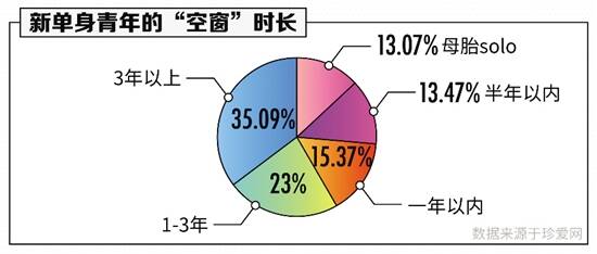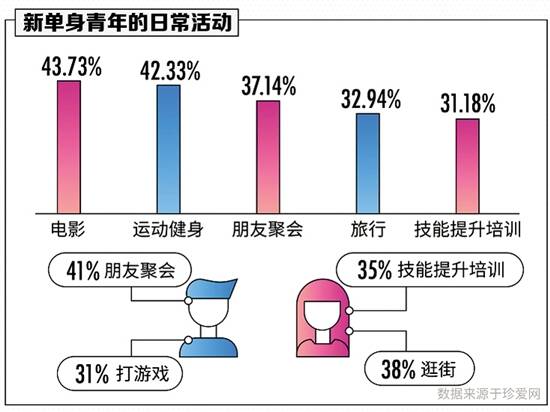 1 新单身青年的情感状态 1.女性平均“空窗期”高于男性 新单身青年的婚恋情况究竟如何?在针对单身时长的调查发现,近四成(35.09%)新单身青年“空窗期”超3年,两成(23%)“空窗期”为1-3年之间,还有一成(13.07%)为母胎solo。从性别的差异上看,女性平均“空窗期”高于男性。(见图1) 2.脱单难点:年纪越大越难心动 “我太难了”这句话让很多新单身青年在脱单这件事上都感同身受。调查发现,社交圈窄(61.63%)、难以心动(51.62%)、性格内向(33.55%)为脱单的主要难点,其次为工作忙、个人经济条件不够好、没有人追求以及对自己长相不自信。 从学历背景看,学历越高越容易遭遇社交圈窄的问题,其中博士群体的社交圈窄问题尤为明显。而在不同的代际方面,年纪越大则越难遇到心动的对象。(见图3) 3.超六成没机会接触“可发展对象” 到底社交圈子小如何影响婚恋呢?调查显示,在工作和日常生活中,超六成新单身青年没有机会接触到可发展恋爱关系的单身异性,均表示周遭的同事朋友要么已婚已恋,要么各方面不合适匹配,三成人表示每年能接触到的合适异性仅3个左右。尤其在占据大量社交时间的职场中,此现象较为常见,调查显示,最难接触到单身可发展异性的职业分别是公务员、程序员及教师;而金融分析师、销售以及空乘则最容易接触可发展异性。(见图4) 对此珍爱网的情感老师张莎莎表示:“人际吸引中有一条很重要的吸引法则叫近距离吸引,也就是我们更容易对身边的人产生好感。若是在平时社交或职场中难有机会接触到潜在可发展的单身对象,这无疑是会对自身的脱单产生较大阻碍和影响。” 从职业特点来看,当然是工作内容越丰富、灵活性越大、直接面对客户的职业更容易接触到潜在可发展的单身对象。比如金融分析师、销售以及空乘,在他们的日常工作中,经常都是直接面对大量客户或服务对象,在形形色色的客户群中,他们的基数很大,潜在发展对象的比例自然更高。相对地,像公务员、程序员、教师等职业每天打交道的要么是固定的群体,要么是电脑,他们的社交群更封闭。 不过,接触“可发展对象”的机会并不能与是否脱单直接挂钩。需要把握住机会,而不是觉得自己机会多就更加挑剔;而机会较少的,应积极行动起来给自己创造更多机会,脱单也不会像想象中那么难了。 4.男青年比女青年更想恋爱 “甜甜的恋爱到底什么时候轮到我?”调查显示,近九成(87.91%)新单身青年渴望脱单投身到恋爱中。并且,男性(95%)比女性(80.9%)更渴望脱单。 调查显示,遇见喜欢的人、感受爱与被爱、想要被照顾是新单身青年想要恋爱的三大原因,其次为到适婚的年龄、排解孤独、父母催婚以及身边的人都脱单了。相比男性,女性想要恋爱的原因更倾向于想有个人照顾自己(44.09%),男性则更多的是因为遇见喜欢的人(37.15%)而想要恋爱。 5.为脱单做的最大努力:下载婚恋社交软件 不只是嘴上说说,对于想脱单的新单身青年,为了脱单也有做过切实的努力。调查显示,近八成(76.8%)新单身青年表示自己为脱单努力过,其中最主要的努力表现为下载婚恋社交软件、努力挣钱、接受相亲或主动去相亲、努力健身或减肥、学习恋爱技巧。 就性别差异而言,男性则更注重经济与能力的提升,女性更注重外观的改善。努力脱单也是新单身青年自我进步的驱动力之一。 新单身青年积极向上的体面生活 2 1.看电影、运动健身、朋友聚会 单身就等于“懒宅”?这届新单身青年完全打破对单身群体的刻板印象。调查显示,看电影(43.73%)、运动健身(42.33%)、朋友聚会(37.14%)、旅行(32.94%)及技能提升培训(31.18%)是新单身青年的普遍日常活动。其中,男性更喜欢朋友聚会(41%)和打游戏(31%),而女性则更喜欢逛街(38%)和技能提升培训(35%)。可见,新单身青年的日常生活远比我们想象的丰富得多。(见图2) 从学历背景看,学历越高,日常活动越喜欢进行技能提升培训和旅行,其中七成硕士人群的日常活动是技能提升培训。而在收入差异方面,收入越高越热爱运动健身。年纪不同,日常活动也有明显的不同,95后日常最爱打游戏,90后最爱朋友聚会,80后则最爱运动健身。 2.新单身青年需要被旅游治愈 情感和生活或许都“太难了”,但是总有治愈生活的办法。调查发现,六成单身青年认为旅行是生活的必要部分。对于疲于生活的新单身青年,时不时看看“外面的世界”是十分治愈的。深入调查显示,新单身青年最喜欢的旅游城市分别为重庆、成都、大理、厦门、西安、丽江、上海、拉萨、佛山和桂林,新单身青年不仅期待在旅途过程中得到放松,同样期待有段甜蜜的邂逅。而在选择旅行同伴方面,他们更倾向和朋友一起(37.02%)或者独自旅行(29.04%),而如果有对象的话,国内游(60.81%)是他们的首选,其次为北欧、日韩游。 3.近六成熬夜成瘾 凌晨1点睡成常态 在是否熬夜的调查方面,数据显示,近六成新单身青年有熬夜习惯。普遍认为超过12点睡觉即为晚睡,他们主要睡觉时间在凌晨1点左右。从代际差异看,95后最爱熬夜,80后最养生。 熬夜成瘾的新单身青年夜生活到底在做些什么?调查显示,煲剧/看综艺(69.38%)、阅读(39.24%)、听歌(31.89%)及加班(30.41%)为新单身青年夜生活主要活动,而蹦迪、K歌、聚会的比例不到两成,可见,相较于外出活动,单身青年的夜生活更钟情于“自己独处”的室内活动。 新单身青年正在崛起的单身经济 3 1.安