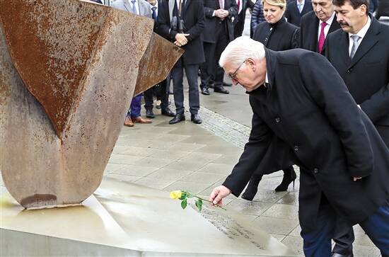 11月9日,在德国首都柏林,德国总统施泰因迈尔(前)在柏林墙倒塌30周年纪念活动中献花。当日,柏林举行活动纪念柏林墙倒塌30周年。新华社发