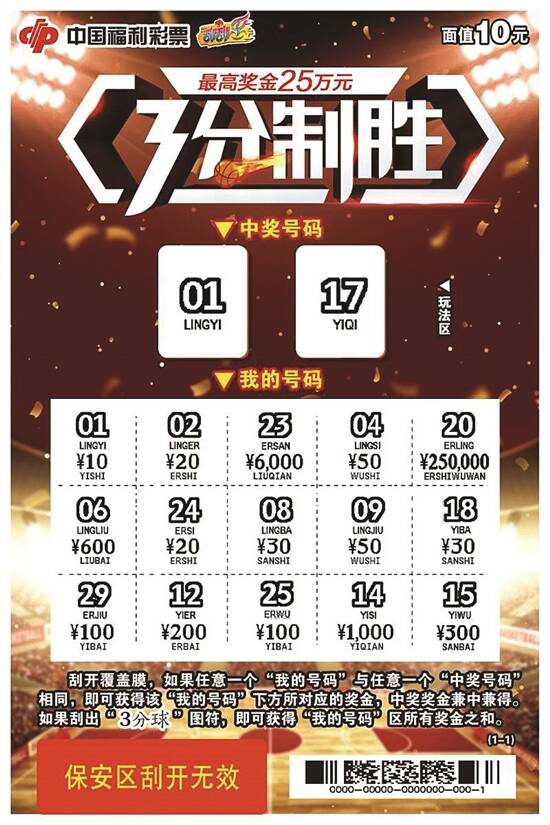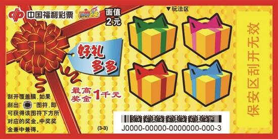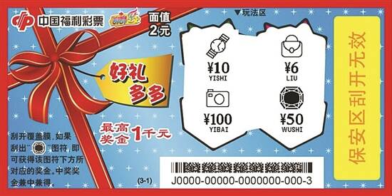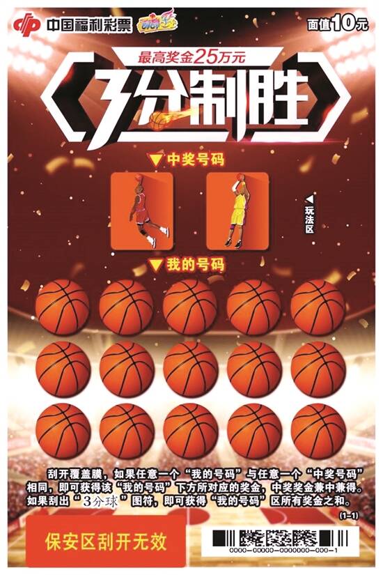 ■新快报记者 陆妍思 通讯员 莫冠婷 “好礼多多”面值2元 最高奖金1000元 “好礼多多”色彩艳丽夺目,整体设计像一件包装精美的礼物,给人温暖大方、幸福满满的感觉。画面左侧设计成一份“大礼物”,一套3张的背景色分别采用明亮的蓝色、绿色、黄色,扎着不同造型的红色彩带搭配不同颜色的背景,十分漂亮。画面右侧,摆放着4个黄色外包装的“小礼物”,缀以红、紫、蓝、绿四色丝带绑成的蝴蝶结,带来不一样的视觉美。刮开的过程就像在拆礼物一样,令人既期待又兴奋。 “好礼多多”采用一套3张的设计,每张彩票面值2元、最高奖金1000元。玩法简单直接,采用刮出指定图符即中奖级的玩法,共有4次中奖机会。刮开覆盖膜,如果刮出“钻石”图符,即可获得该图符下方所对应的奖金。中奖奖金兼中兼得。“中奖宝石图符”辨识度高,非常直观,贴合主题。不中奖图符造型与中奖图符差别很大,不易弃奖。 “3分制胜”面值10元 最高奖金25万元 开心、热闹、狂欢,射灯齐刷刷地将篮球赛场球场照得通明,喝彩声、鼓掌声、呐喊声此起彼伏,篮球争霸总决赛正在火爆上演!——刮刮乐新票“3分制胜”的画面设计和玩法与篮球比赛场景高度契合。彩民如身临现场,在比赛接近尾声的决胜时刻,使出浑身解数,围绕三分线寻找机会,最后出手投球,用一个完美的远投,命中3分! “3分制胜”每张彩票面值10元,共有11个奖级,最高奖金25万元。其玩法简单易懂:刮开覆盖膜,如果任意一个“我的号码”与任意一个“中奖号码”相同,即可获得该“我的号码”下方所对应的奖金,中奖奖金兼中兼得。如果刮出“3分球”图符,即可获得“我的号码”区所有奖金之和。