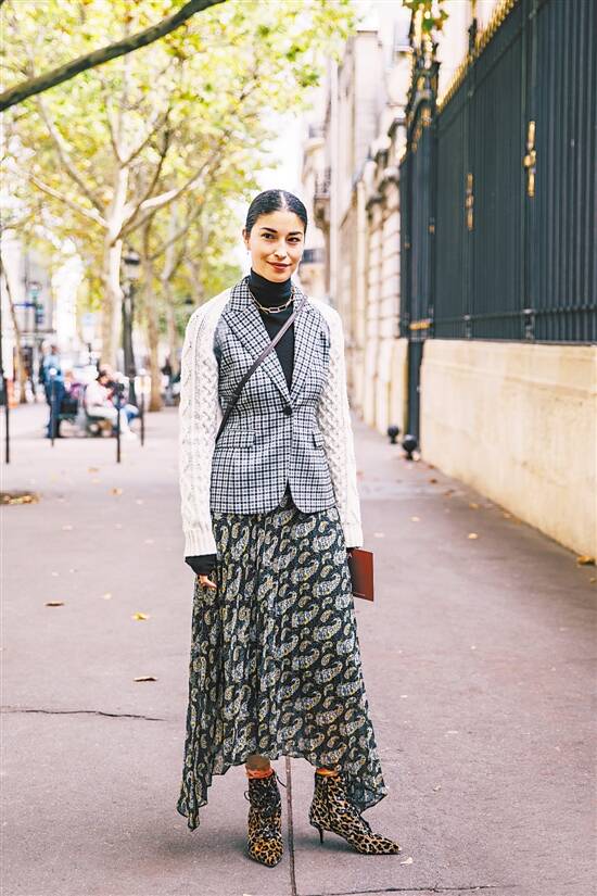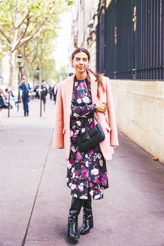 ▲ 长度过膝的各种飘逸长裙,搭配黑色膝下靴,看不出靴筒的长度,也就避免了腿部线条被破坏显矮的缺点,只是露出脚踝和脚部的线条,飘逸柔美和硬朗随意的碰撞,让整体造型时髦度满分。 |