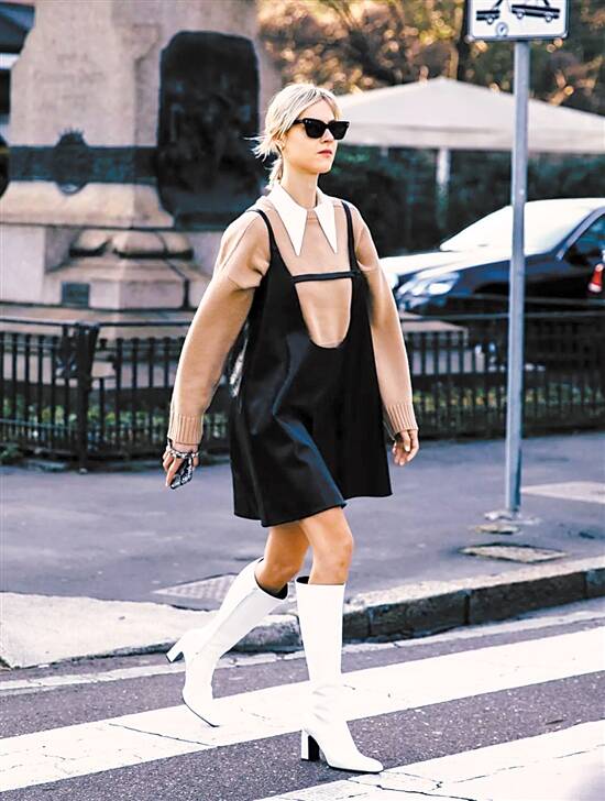 ▲ 不太冷的时候,光腿搭短裙或短裤,用宽大的外套来打造“头重脚重中间轻”的造型结构,既能压住脚上的靴子,还可让露出来的那截腿显得纤细,搭配心机藏得够深。 |