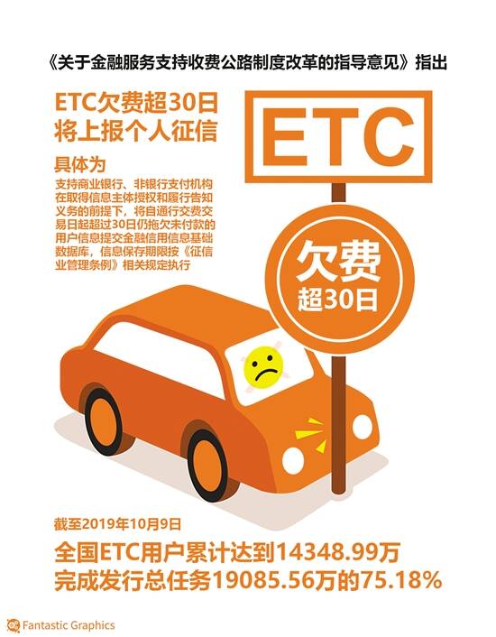 关闭小额免密免签服务 《意见》要求商业银行、非银行支付机构应为ETC记账卡用户提供便捷的扣款账户绑定及扣款服务,方便用户快速开通使用ETC服务。不得无故拒绝用户绑定已有账户,不得强行要求用户新开账户绑定,不得在用户办理ETC业务时强制搭售其他服务或产品。无合理理由不得拒绝用户解除绑定账户,不得故意引导已安装ETC用户变更扣款账户,避免不必要的重复安装和社会资源浪费。鼓励商业银行采取措施针对性解决货车等具有大额通行费支付需求的营运类车辆相关ETC业务需求。 《意见》明确,商业银行原则上应停止新增发行ETC联名卡,用户确有需求的,商业银行应在发行时默认关闭小额免密免签服务,并向用户充分提示风险。对于已发行的存量ETC联名卡,发卡银行应抓紧批量关闭相关小额免密免签服务,并妥善做好用户告知工作。对于用户主动要求开通小额免密免签服务的,商业银行应充分做好风险提示。 《意见》还提出,在支持商业银行、非银行支付机构在取得信息主体授权和履行告知义务的前提下,将自通行交费交易日起超过30日仍拖欠未付款的用户信息提交金融信用信息基础数据库,信息保存期限按《征信业管理条例》相关规定执行。 实现车道收费移动支付全覆盖 意见指出,人民银行各分支机构要与各地方政府密切沟通,在做好ETC推广相关工作的同时,以移动支付便民工程为依托,推进尚未支持移动支付的人工收费车道建设,力争2019年年底前所有人工收费车道均支持移动支付产品。商业银行、非银行支付机构和清算机构应与相关收费公路联网结算管理机构、ETC发行服务机构联合联动,通过线下网点、线上APP等多渠道加大ETC、移动支付知识宣传普及,共同完善用户服务等配套工作。 11月14日,交通运输部通报,5月15日以来,全国累计新增ETC用户6281.31万,完成新增发行任务11017.88万的57.01%。截至10月9日,全国ETC用户累计达到14348.99万,完成发行总任务19085.56万的75.18%。