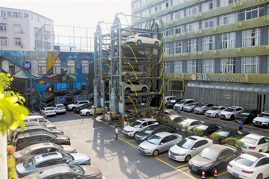■立体停车场具有占地少、自动化程度高等优势,但取车时间长、建设审批复杂也成为影响其发展的重要因素。图为位于广州天河沙太路的一家立体停车场。新快报记者 毕志毅/摄 |