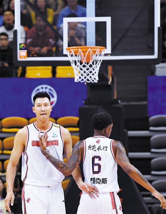 ■昨日,广东东莞银行队球员布鲁克斯在比赛中祝贺队友易建联(左)加冕CBA得分王。新华社发 |
