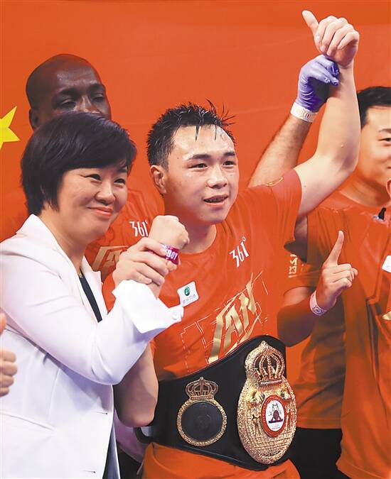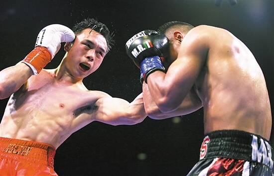 ■中国拳手徐灿(左)和美国拳手罗伯斯在比赛中。 新华社发 |