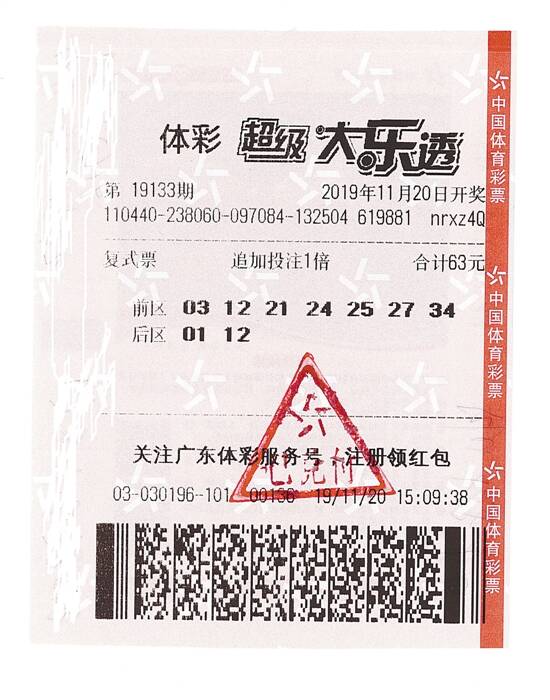 用笔记本记录选号 大乐透第19133期的中奖号码是:前区“03、12、24、27、34”;后区“01、12”。当期全国共中出3注一等奖,其中1注为1800万元(含800万元追加奖金)追加投注一等奖,落户广东;2注为1000万元基本投注一等奖,分落黑龙江、安徽。数据显示,广东中出的1800万元追加头奖落户珠海,中奖彩票是一张63元的“7+2”追加复式票,加上小奖单票总奖金1803万多元。 兑奖过程中,黄先生说自己买大乐透已经很多年了,都是靠自己去选号,以小复式为主。黄先生还向记者掏出一个笔记本,上面记录了他购买的全部号码。可以看出,黄先生对体彩大乐透确实是付出了很多心思,这一次中奖是功夫不负有心人。 买彩票就是做善事 黄先生感叹到,幸好进行了追加,可额外多拿80%的奖金。在问及奖金怎么安排,黄先生笑着说,别看他兑奖来得“火急火燎”,心态却十分平和:“一时还没有具体规划,不过我想先休息一段时间,买彩票最重要的是心态好,没有中奖的时候,就当做善事,中了奖以后也要心态平和,不要乱了方寸。” 在广大市民的大力支持下,今年截至10月份,珠海市体育彩票共销售4.14亿元,为国家上缴偶然税949.53万元,为珠海本市筹集了体彩公益金3247.28万元,对体育事业和其他公益事业做出了巨大贡献。