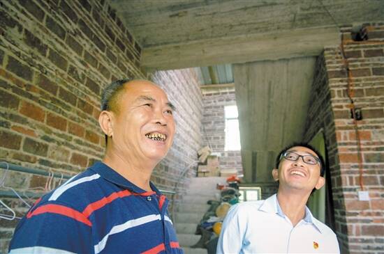 ■贫困户丁展林(左)望着新居墙面跟杨柱立说:“再攒点钱,就刷房子!” |