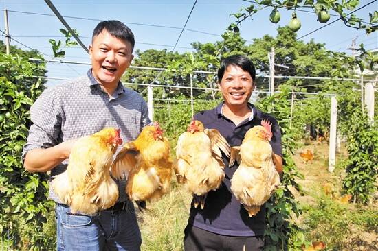 ■驻村工作队第一书记陈海涛(左)和扶贫队员郑乃旺(右)向记者展示胡须鸡。 |