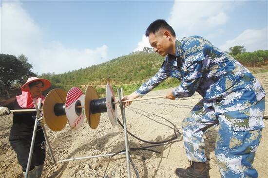 ■南海舰队派驻湛江廉江市塘蓬镇六环村驻村第一书记兼扶贫工作队队长朱江在田头和当地群众一起耕作。 |