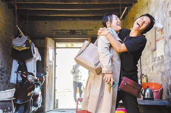 ■城东村贫困户梁秀红(右)抱住驻村书记王淑娟不放。 |