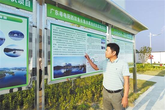 ■阳西县农业农村局扶贫股股长陈永利正在介绍阳西县儒洞镇长角水库广东粤电阳西双鱼长角水库光伏发电扶贫项目。 |