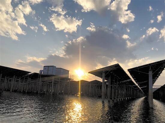 ■夕阳下1350亩的阳西县儒洞镇长角水库广东粤电阳西双鱼长角水库光伏发电扶贫项目。 |