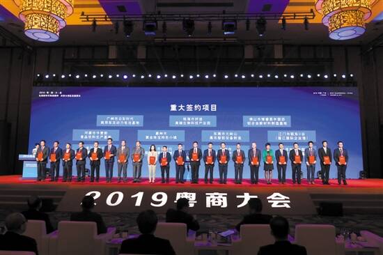 ■昨日,2019年粤商大会在长隆国际会议中心举行。图为重大项目签约仪式,代表上台签约并合影。 |