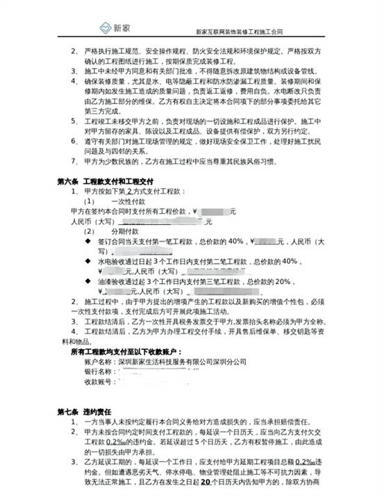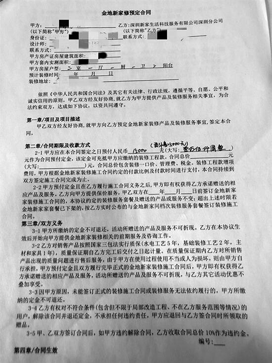 ●您可通过以下方式提供线索 报料邮箱:xkb315@126.com 新快报官方微信:gd_xkb 新快报新浪微博:@新快报 http://t.sina.com.cn/gdxkb 交定金时不给看正式合同,交完拿到后发现工程未全部完成就要交全款?近日,深圳的崔先生表示,付定金后曾对装修公司提出想要修改正式合同,未果,还得到如果不签合同就不能退定金的答复。 11月27日,涉事商家回应,对方交定金时还未正式开始服务,所以不能提供正式合同,当时双方已自愿签署定金不退的合同。装修往往是业主们“绕不过的坎”,记者调查发现,装修合同和付款方式问题在商家处常有不同标准,且消费者常未重视此类问题。 ■新快报记者 肖韵蕙 文/图 投诉 交定金时只给定金合同 并不给看后续付款方式 崔先生表示,今年3月份,他在金地新家生活科技服务有限公司深圳分公司咨询房子装修事项并支付了15000元定金,同时确定了初步的“全屋定制整装”套餐。崔先生称,因为当时自己的房子并未交房,销售人员便并没有告知具体的装修方案,包括后续的付款金额、付款方式等问题双方也并未商定。崔先生说,当时他曾要求对方把正式合同给他看,并未得到同意。 今年6月,崔先生房子已交房,于是便在9月的时候找到装修公司,想要签正式的装修合同。崔先生表示,销售人员在签合同一周之前把合同发给他看了,当时他就提出异议。“合同显示在我装修没有全部完成的情况下就要交齐全款,我认为这是不公平的。”崔先生称,如果看到了这样的付款方式,他当初是不会交定金,也不会交定金合同的。 在崔先生提供的正式合同中,显示工程款支付和工程支付有两种方式,一种是一次性付款,即在签正式合同时支付所有工程价款。第二种是分期付款,签订合同当天支付第一笔工程款,为总价的40%;水电验收通过日起3个工作日内支付第二笔,为总价的40%;油漆验收通过起第3个工作日内支付第三笔,为总价剩下的20%。 崔先生表示,自己定制的是整装,油漆验收后还并没有全部完工,如果按这样的付款方式很容易出现问题。这些一旦发生,都没办法再去找装修公司责任。崔先生希望能留20%尾款,大家协商验收标准,装修完毕,验收通过了才付款。 在对装修公司提出异议,并希望能修改合同条款之后,崔先生称对方并不同意,并拒绝对合同条款作出任何修改。同时表示,如果崔先生不按这份正式合同签约付款,就算是他违约取消合作,根据之前双方签的定金合同,定金不予退还。 崔先生表示,他和装修公司多次协商,希望能修改合同条款或者退定金,都未果。 回应 已事先告知定金不退 尾款要付才能买家具 11月27日,金地新家生活科技服务有限公司深圳分公司相关负责人对新快报记者表示,在与崔先生签定金合同时,已经告知他定金是不退的。同时他表示,崔先生交了定金只是为其保留优惠(即交纳定金能有一定优惠),崔先生还并未开始享受服务,因为还未交房也没有正式确定计价规则,所以是没有权限看正式合同的,只有在正式签订时才能看。而在被问到定金为什么不退的问题时,该负责人又表示已经为崔先生产生了一定的咨询服务费,并为其做了初步的设计方案了。 对于付款方式问题,该负责人称,在崔先生交定金的时候已经跟他口头说过分期付款的时间和方式了。而尾款支付的时间是等油漆完工且橱柜等家具已经全部定好之后,那时候全部工期已经完成将近90%了,只需等工人进行最后的装柜了。另外,对方表示之所以需要在油漆完工就支付尾款,是因为尾款付了才能为崔先生买家具。对方表示,目前定金无法退还。 同时该负责人透露,目前家装行业并没有统一的合同范本和付款方式,基本都是各装修公司自己确定。他称一次性付全款的公司也是有的。 11月28日,新快报记者再次询问崔先生,是否在签定金合同时被口头告知过付款方式,对方予以否认。 调查 有装修公司只能一次性付款 大部分公司定金支付比例高 11月27日,新快报记者询问了几家装修公司。关于费用问题,一家装修公司表示会提供套餐,设计师可以上门量房和出设计方案。另一家装修公司表示并不提供套餐,要根据项目现场计算费用。 关于付款方式,一家公司表示只有部分城市支持分期付款,两家公司表示会分期支付,但工程未完成前支付比例较大。一家是签合同之后分别支付15%、40%、40%、5%,而四笔费用没有具体时间,是等每一个阶段质检合格了,就支付下一笔费用,尾款是最后工程验收后支付。另一家公司表示是分三期付款,定金比例较高。签合同后付50%定金,泥水铺贴施工前付第二期45%,竣工之日起三天之内付尾款5%开具保修卡。 定金问题记者询问的装修公司表示并不能退,只能抵装修款。一家装修公司表示只有一个正式合同,并没有定金合同,签合同之后才付款。当记者询问如果质检不合格或者顾客不满意要如何处理,对方表示会拆了重做,并未更多提及赔偿或者违约事项。 点评 做法没有问题 但应该告知基本条款 广东保典律师事务所合伙人、公益律师廖建勋对新快报记者表示,商家把与消费者签订的合同分为定金合同和正式合同是合法的,但在签订第一个合同时,应该告知消费者后续签订正式合同的基本条款,包括付款的方式等,商家是有义务告知来保证消费者的知情权的。对于商家按照格式样本提供的合同,属于格式条款。对于格式条款消费者是有权利提出修改或者补充的。如果商家在其格