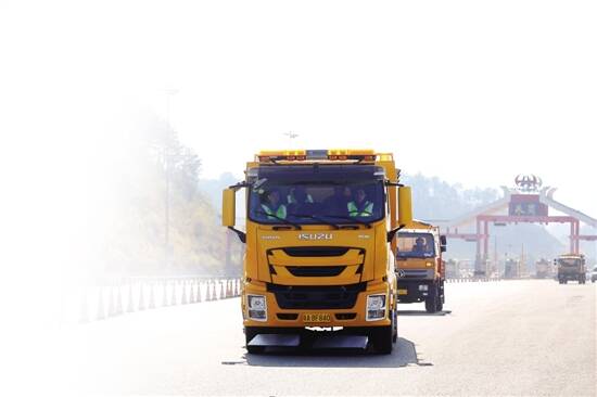 昨天下午,二广高速在朱岗至九嶷山路段联合高速交警、拯救、养护单位等实施应对冰雪灾害天气应急处置演练。 在航空发动机巨大的轰鸣声中,吹雪车开始“除冰”作业。两台自动撒布车跟在吹雪车200米后,撒布融雪剂预防路面再次结冰。1台警车、1台路政车、1台养护车分别在超车道、主车道、紧急停车带紧随其后,后方车辆有条不紊跟着车队行进。 二广高速自开通以来,每年冬春季节都要遭遇冰雪灾害天气,抗冰保畅一直是路段管理重点。经过多方总结探索,2018年底,二广高速引进吹雪车用于高速公路除冰作业。人工除冰速度约为每小时9公里速度,而吹雪车右侧主喷管及前方双喷管同时作业,除冰时速最高可达40至50公里,效率提高近5倍;更重要的是不需要封路作业,既提高了安全指数,也保障了车辆通行。