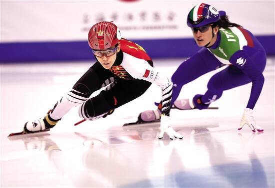 ■范可新(左)在短道速滑世界杯上海站女子500米决赛中夺得冠军。 新华社发 |