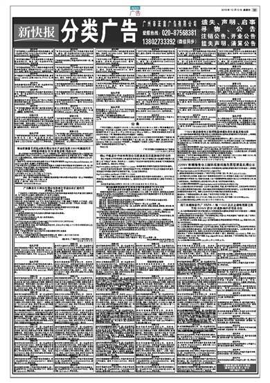 020-87568381 登报热线: 注销公告、开业公告 13802733392 (微信同步) 挂失声明、清算公告 遗失声明 广州移哟投资咨询有限公司遗失地税税务登记证副本,税号:44011135574384X,现声明作废。 遗失声明 广州市海珠区大众棋牌室遗失营业执照副本,统一社会信用代码:92440101MA59J8PW0D,编号:S0592015002037G,现声明作废。 遗失声明 广州市增城新恒逸土石方工程服务部遗失地税税务登记证副本,地税粤字号:4401111979101030 3201,纳税人编号4401835052982,现声明作废。 遗失声明 广州市花都区狮岭六合发展皮革商行不慎遗失营业执照正本,副本(统一社会信用代码:440121600008980)。声明作废 遗失声明 罗子超遗失万达集团开具的购房收款收据,票号0051817、0052029,金额:50000元、477318元,声明作废 遗失声明 徐连弟遗失营业执照正副本,统一社会信用代码92440101MA5A9EWG7B,声明作废。 遗失声明 广州市番禺区石楼诗思小吃店遗失营业执照正副本,统一社会信用代码92440101MA5AL2K L4H,声明作废。 遗失声明 慧恩酒店设计(深圳)有限公司广州分公司遗失营业执照正副本,统一社会信用代码91440101M A5AUUUNXC,声明作废。 遗失声明 广州市花都区狮岭虹鑫手袋厂遗失营业执照正本,社会信用代码:92440101MA5CD202XF,法人:陈姗娅,现声明作废。 注销公告 广州市中孚体育发展有限责任公司,统一社会信用代码91440106MA59B4WP36经股东会决议,拟向公司登记机关申请注销登记,现已组成清算组进行清算,请有关债权人于见报之日起45日内向本公司清算组申报债权及办理债权登记手续,逾期视为放弃。 特此公告 遗失声明 广州驴妈妈国际旅行社有限公司星晖二街营业执照正本(统一社会信用代码:91440101MA5AQLTD59)、旅游局备案登记证明(编号:L-GD-CJ00509-HZMSB172),声明作废。 遗失声明 广州市白云区金沙散打哥工作室遗失营业执照正、副本,统一社会信用代码92440101MA59N 4HJ4F,注册号440111601785588,声明作废。 遗失声明 广州创团贸易有限公司遗失财务专用章一枚,现声明作废。 遗失声明 广州市越秀区标新工艺品商行遗失营业执照副本,统一社会信用代码:92440101MA5AC0PE4M,编号:S0492014057144G,声明作废。 遗失声明 广州市白云区石井景尚室内装饰店遗失营业执照正、副本,注册号:440111601140403,编号:S1192014057243G,声明作废。 遗失声明 广州市增城澳特画材加工部遗失国税税务登记证正本,税号:44012519730213172400,现声明作废。 遗失声明 广州市增城澳特画材加工部遗失地税税务登记证正本,税号:44012519730213172401,现声明作废。 遗失声明 广州市增城澳特画材加工部遗失营业执照副本,注册号:440125600504270,编号:S2592015002 778G,声明作废。 遗失声明 爱尔兰莱特集团广州代表处(登记证号:91440101732955857Y)遗失首席代表证一本,首席代表姓名:AISLING BYRNE,声明作废。 增资公告 广州齐家贸易有限公司股东决定,注册资本由原来3万元人民币增加到100万元人民币。请债权人自本公告见报之日起45日内向本公司申报债权,逾期不申报,视为放弃权利,本公司将向公司登记机关申请变更登记。 清算公告 广州市衍薇太素生物科技有限公司股东会决议,本公司停止经营,清理债权债务。请债权人自本公司公告见报之日起45天内,向本公司清算小组申报债权。逾期不申报,视为放弃权利。清算结束后,本公司将向公司登记主管机关申请注销登记。 佛山市新量子环保材料有限公司年产水性涂料2000吨新建项目 环境影响报告书(征求意见稿)信息公开 佛山市新量子环保材料有限公司(“以下简称我公司”)委托环评单位编制的《佛山市新量子环保材料有限公司年产水性涂料2000吨新建项目环境影响报告书(征求意见稿)》(以下简称“报告书”)已基本编制完成。根据环评法和《环境影响评价公众参与办法》,现将报告书信息向公众公开,并征求意见。 (1)报告书全文查阅方式和途径:报告书全文可通过网络链接:http://www.sdies.com/Information_detail/707.html查询,或到我公司查阅纸质版。 (2)征求意见的公众范围和方式:项目评价范围内(见报告书评价范围图)的受影响的公民、法人和其他组织,可通过①信函、电子邮件或电话,②登录网址 http://www.sdies.com/Information_detail/707.html填写公众意见表等方式提出意见。 (3)信息公开和征求意见的起止时间。 公示日期为2019年12月3日起10个工作日。 建设单位:佛山市新量子环保材料有限公司 地址:佛山市顺德区佛山市顺德区勒流街道办事处冲鹤村委会连富一路85号顺德勒流光电产业中心3栋102号和10栋101号 联 系 人:陈小姐 ,电话:0757-22256278 邮箱地址:13679880818@163.com 广东腾龙化工科技有限公司造纸化学品技改扩建项目 环评第二次公示 广东腾龙化工科技有限公司造纸化学品技改扩建项目环境影响报告书征求意见稿已编制完成,为广泛征求公众意见,现将项目公示,征求公众意见。 项目名称:广东腾龙化工科技有限公司造纸化学品技改扩建项目 建设地点:广东省东莞市虎门港立沙岛石化仓储及精细化学工业基地 项目内容:技改扩建投资1800万元,技改扩建完成后全厂产能:羧基丁苯胶乳15万吨/年, AKD 中性施胶剂5万吨/年,干强剂5万吨/年,表面施胶剂3万/年吨,抗水剂1万吨/年,湿强剂1万吨/年。技改扩建不新增员工,不改变总占地面积及建筑面积。 一、环境影响报告书征求意见稿全文的网络链接及查阅纸质报告书的方式和途径 网络链接:https://pan.baidu.com/s/1rWqzOplmNa1ayJVxi3Ydmw 提取码:bs