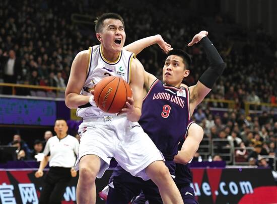 ■12月12日,时代中国广州队球员陈盈骏(右)在比赛中防守北京控股队球员张帆。 新华社发 |