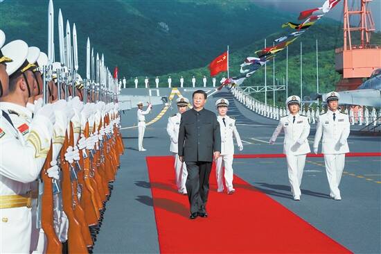 12月17日,我国第一艘国产航空母舰在海南三亚某军港交付海军。习近平出席交接入列仪式并登舰视察。这是仪式结束后,习近平登舰检阅仪仗队。航母命名为“山东舰”,舷号“17”。南部战区等负责同志参加仪式。 03