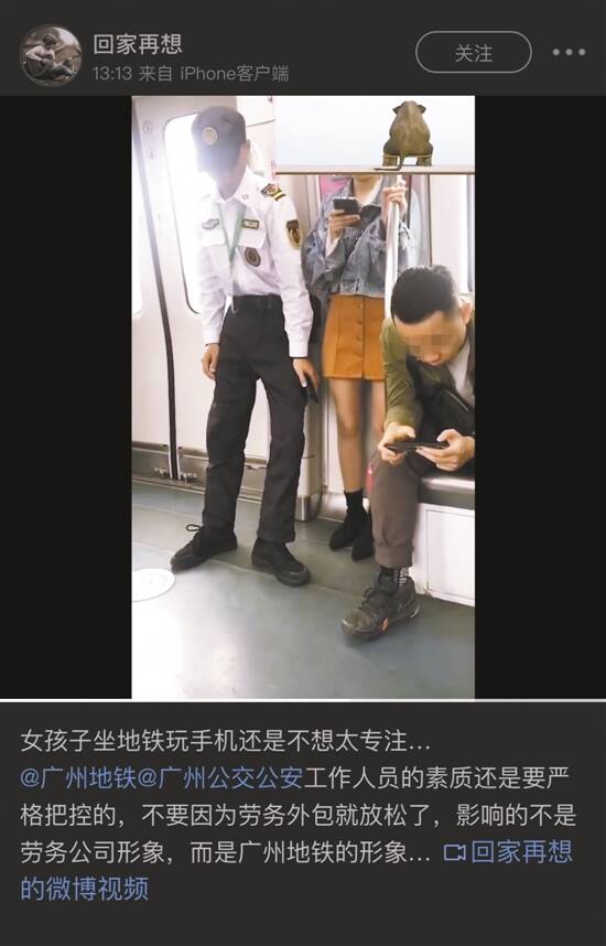 昨日13:13,新浪微博网友@回家再想发布一段视频,15秒的视频里,一位穿着短裙、倚靠在列车门边的女乘客在专心看手机,丝毫没有留意到一位穿着广州地铁安检员制服的男子,正伸出手机偷拍她裙底。网友在举报视频里表示,女乘客坐地铁玩手机不能太专注,广州地铁和广州公交公安要对安检人员的素质严格把控。 15:21,@广州地铁在该网友微博下评论:您好,根据您提供的视频信息,我们已锁定该涉事人员,并报警处理。目前,警方正在调查。我们对此类行为坚决零容忍!感谢您的监督。 17:42,@广州地铁正式发出微博进行回应:接网友举报,列车上一名安检人员偷拍女乘客,我们接报后高度重视,立即核查,锁定该涉事人员并报警。目前,警方正在调查。基于网友提供的视频,该涉事人员已严重违反纪律,安检单位决定解除与该涉事人员的劳动关系。我们督促安检单位全面强化安检人员的管理和教育。对于此类行为,我们深恶痛绝,处理上坚决零容忍!我们将和广大乘客一起维护地铁的良好乘车环境!