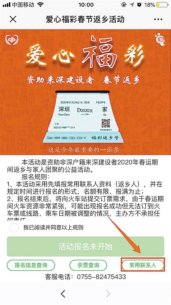 ■新快报记者 陆妍思 通讯员 邓雪玲 资助模式有两种 该活动的汽车票除保持汽车散票外,为加大对深圳对口扶贫地区务工人员的帮扶力度,仍继续开展河池和百色节后返深包车模式。汽车票共开设20条线路,去往成都、重庆、荆州、信阳、攸县、河池等(详情登录深圳福彩微信服务号查询)。散票乘车点可从深圳(银湖)汽车站、龙岗长途汽车站、宝安汽车站中选择,散票乘车日期为2020年1月15至19日,节后返深包车由百色驻深办事处和河池驻深办事处负责征集。 微信注册及报名 汽车票订票通过“深圳福彩服务号”进行注册及报名。注册时间为2019年12月20日至12月28日(每天9:00-22:00)。注册时需提交申请人姓名、身份证号码、联系电话、身份证照片、在深证明等。报名时间为2019年12月26日至12月28日(每天9:00-18:00),先报先得,额满为止。领票地点是深圳(银湖)汽车站的售票大厅。有需要的来深建设者可以提前关注“深圳福彩服务号”微信公众号,进行身份信息注册。汽车票领票为2020年1月3日至1月6日。 资助对象非深户 此次活动对资助者要求是非深圳户籍且在深圳工作的来深建设者,返乡目的地应与其身份证户籍所在省(直辖市、自治区)一致;具有能证明在深圳市工作或居住的有效文件(居住证,社保证明,就职单位开具的在职证明,所在街道、居委会、社区工作站等出具的居住证明,证明材料提供其中一件即可);年龄18至60周岁并符合乘坐火车或长途汽车的身体条件。 一次订票仅限1人,一人仅限1票,领取乘车证(或车票)时需出示本人身份证、在深证明及提供复印件1份,现场签订资助协议书,已领取乘车证(或车票)的外来务工人员乘车时须持乘车证(或车票)、本人身份证乘车,乘车时与登记时的资料不符,不予上车,视为弃权。 为了让需要帮助的人得到资助,报名者在出票后无故放弃取票将列入黑名单,取消往后三年活动订票资格,所订出的车票不得转让、改签、退票。