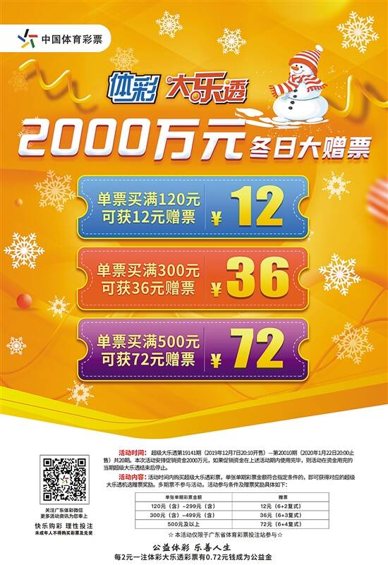 [12月16日,体彩大乐透第19144期开奖,当期中出5注头奖,其中2注为1800万元追加头奖,由广东独中。开奖后奖池失守16亿元大关,录得15.98亿元,支持顶格派奖的“浮动奖特别奖”进入倒计时。] 佛山、汕尾同中1800万 体彩大乐透第19144期的中奖号码为:前区“02、05、20、28、31”;后区“02、11”。前区号码大小比3∶2,奇偶比2∶3,“28”“31”分别遗漏28期、21期后开出,“02、20”均在遗漏2期后再度开出;后区则开出一小一大的偶奇组合。 当期全国共中出5注一等奖,其中2注为追加投注一等奖,单注奖金1800万元(含800万元追加奖金),全部落在广东;3注为基本投注一等奖,单注奖金1000万元,分落山东、湖北和四川。 数据显示,广东中出的2注1800万元追加投注头奖分别出自佛山、汕尾,前者中奖彩票为一张15元5注单式追加票,后者中奖彩票为一张63元“7+2”追加投注复式票,单票总奖金1803万多元。 山东中出的1000万元基本投注头奖出自济南,中奖彩票是一张336元“8+3”复式票,单票总奖金1050万多元;湖北中出的1000万元基本投注头奖出自武汉,中奖彩票是一张“9+3”复式票,投注金额756元,单票总奖金1052万多元。 四川中出的1000万元基本投注头奖出自成都,中奖彩票是一张336元“8+3”复式票,单票总奖金1050万多元。 广东2000万赠票进行中 同期二等奖中出153注,每注奖金22.01万多元;其中16注采用追加投注,每注多得奖金52.60万多元。追加后,二等奖单注总奖金为17.61万元。 当期是新规则上市后的第126期开奖,通过2.93亿元的全国发行量,为社会筹集彩票公益金1.05亿元。奖池方面,当期开奖结束后,15.42亿元滚存至今晚开奖的第19145期。 须提醒彩民的是,根据目前奖池的泄洪速度,大乐透奖池将于未来一两期内下降至15亿元以下,支持顶格派奖的“浮动奖特别奖”即将退市。目前广东购彩者购大乐透更有双重利好,广东体彩自第19141期开展大乐透2000万元赠票活动,只需购买单张单期彩票票面金额符合指定条件的,即可获得对应的大乐透机选赠票奖励,具体为:购票金额120元(含)-299元(含)赠12元“6+2”复式;购票金额300元(含)-499元(含)赠 36元“6+3”复式;购票金额500元及以上赠72元“6+4”复式,不设投注方式、中奖条件等限制。