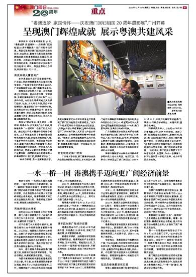 新快报讯 记者黄闻禹报道 17日,“粤澳追梦 家国情怀——庆祝澳门回归祖国20周年摄影展”在广州图书馆开展。展览全面展示澳门回归以来在政治经济、社会民生、教育文化等方