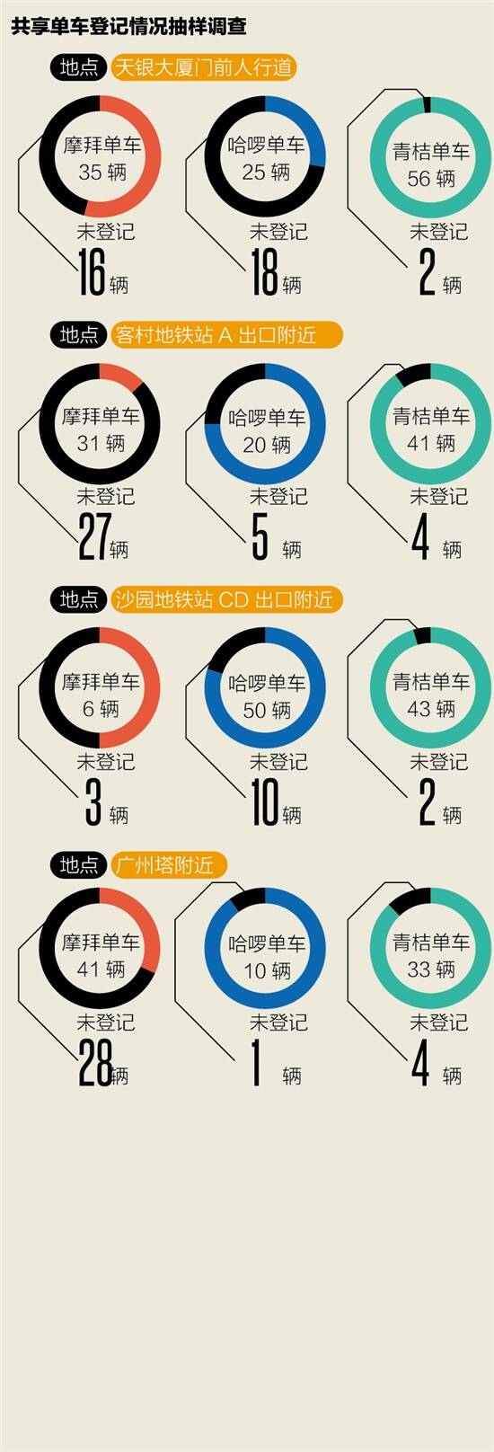 扫码输编号查询结果迥异 不一样的青桔一样的编号 新快报记者在使用“广州市共享单车扫码核查”小程序时,除了发现大量信息未登记车辆,还发现滴滴青桔单车扫码和输入编号得出的结果不同,涉嫌“一码多用”的情况。 新快报记者对棠东牌坊前的20辆青桔单车进行扫码,发现结果均为“该车辆已登记”。随后,新快报记者用输入车辆编号的核查方式进行查询,却发现结果均为“车辆未登记”“涉嫌违规投放”。 如车辆编号为27720487的青桔单车,输入编号来验证则显示“涉嫌违规投放”,而扫码显示“车辆已登记,编号为15959907”。车辆编号为26781495的青桔单车,输入编号同样显示“涉嫌违规投放”,而扫码却显示“车辆已登记,编号为15928749”。新快报调查发现该位置停放的20辆均出现上述情况。 为了进一步确定此情况,新快报记者再次选择几处不同的位置进行扫码,发现同样存在结果不一致的情况。客村地铁站B出口走向丽影广场附近,新快报记者扫码发现15辆青桔单车中14辆显示已登记,但其中有10辆出现手机显示的编码与车身编码不一致现象。随后,新快报记者通过输入编码的方式检查,发现这15辆青桔单车中仅有4辆显示已登记,不知是否用了与车辆不符的虚假二维码防止被查?又如,车身编码26947217的青桔单车,在滴滴APP上的车辆编号显示是16170347,使用“广州市共享单车扫码核查”小程序扫码后,显示车辆已登记,编码是17042663。另一辆车身编码25307807的青桔单车,滴滴APP上的车辆编号是15610587,而用小程序扫车头码核查,这一辆青桔也是车辆已登记,不过登记编号也是17042663。两辆车身编码不一样的青桔,在“广州市共享单车扫码核查”小程序核查的编码竟然一样,有一码多车达到多投放的嫌疑。 现象4: 落锁即被罚款还有人乱停 市民叹禁停区标识不明显 新快报记者12月15日走访了广州塔周边地区。作为广州的旅游“打卡”地,周末来这里游玩的游客较多,地铁站出口人流量大。在广州塔地铁站B出口新快报记者看到41辆摩拜单车、33辆青桔单车和10辆哈啰单车整整齐齐地停放。在此处停车的市民杨阿姨告诉记者,因为这里是哈啰单车的禁停区,所以蓝色的哈啰单车较少。 新快报记者骑着哈啰单车到了广州塔东广场准备锁车时,发现这里是禁停区,由于是第一次违停,手机收到警告:“您本次违规在城市禁停区范围内停车,在此违规停车将会收取调度费5元。”第二次记者再停到禁停区,则被罚款了5元。根据APP上的提示,如果是在非服务区落锁,最高可收取20元/次的调度费。 12月17日,新快报记者将共享单车停到中山一路杨箕村村口都城快餐门口,这里停有不少共享单车,但一锁车,立即被扣了5元钱,短信提示:“这里是禁停区,罚款5元。”但在锁车前,新快报记者并未收到这里是违停的相关通知,也没有在此处看到任何禁止停放共享单车的指示标牌。新快报记者打客服电话沟通后,客服称,“共享单车刚好在禁停与非禁停附近,扣错钱了”,随后给记者退还了5元罚金。 至于为何在禁停区乱停乱放,市民杨女士告诉记者,有的区域没有明显的标识“禁止停放共享单车”,有的路段没有划出白色停车框,而直到使用锁车后,才告知是禁停要罚款。希望相关部门和企业能够有更明晰的提醒和指示。 把车停在禁停区 请企业搬回去,合理 禁停罚款,市民怎么看? 新快报记者了解到,摩拜单车对于在“灰色禁停区内关锁”的车辆收取额外5元管理费,若在退款时效内将运营区外任意一辆单车骑回运营区内并关锁停车,管理费将退还账户。 青桔单车对于停在营运区外的车辆收取5元调度管理费,停在禁停区的车辆收取2元调度管理费。 哈啰单车对于将单车停放在运营区外的行为则会产生5-50元的罚款。不过在24小时内,将服务区外的任意一台单车骑到服务区内锁车,可退还调度费。其中,开关锁位置均在服务区外,调度费10元,不支持退换。 违停付违约金,市民怎么看?“我在大夫山景区骑摩拜单车被罚过钱,有一两元吧。当时知道是禁停区,但非禁停区在两公里外,实在太远了。”陈先生认为,调度费不算罚款,自己在骑单车的时候也承诺不违停,因此从信用押金里扣钱也合情合理。“我把车停在那里(禁停区),他们收钱来处理也算正常,”陈先生说。 企业回应 哈啰出行: 数据更新或有滞后 将提升精细化运营 违规投放此类情况如果存在,或是数据更新滞后问题,有一定的时间差。我们将积极与交通部门进行技术方面沟通,争取尽快解决。 哈啰出行会与有关部门保持良好沟通,进一步提升精细化运营管理水平。 摩拜单车: 加快回收废旧车步伐 部分摩拜单车扫码出现违规情况,多是由于报废回收阶段信息更新滞后问题。针对这一点摩拜单车正努力和主管部门沟通以尽快解决。因此,在本地加快回收废旧车的步伐是当前摩拜广州最重要的事情之一,针对个别区域的运营管理及调度,部署城乡回收。 青桔单车: 采取现场验证接入模式 青桔单车与广州市交通系统对接的号码为车辆唯一ID,与车锁码不同,类似于机动车的车架号和发动机号的区别,导致扫描出来的二维码与数量对不上。因为车锁需要更换维修,但在监管测试的扫描端是能够看到扫描车辆位置,从而验证车辆是否接入。目前,青桔单车已与交通局沟通,尽快修改接入模式,采取可现场验证的接入方法。
