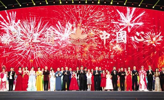 ■19日,庆祝澳门回归祖国20周年文艺晚会在澳门东亚运动会体育馆举行,习近平观看演出。晚会最后,习近平走上舞台同全场观众一起高唱《歌唱祖国》。新华社发 |