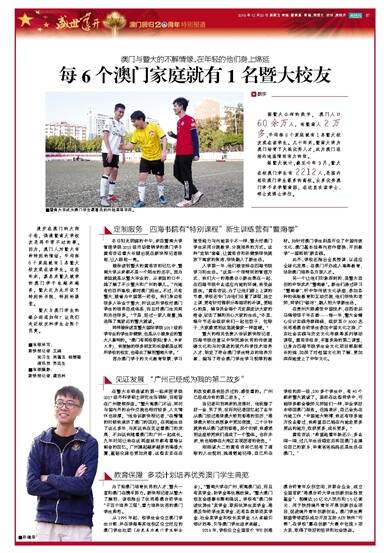 据暨大公布的数字,澳门人口60余万人,有暨南人2万多,平均每6个家庭就有1名暨大校友或在读学生。几十年来,暨南大学为澳门培育了大批优秀人才,成为澳门连接内地温情而有力的弦。